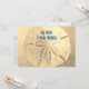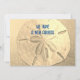 Anuncios de nueva dirección con imagen de dólar de arena. Anuncie una nueva dirección en la costa con tarjetas planas personalizadas que tienen plantillas de texto en el anverso y el reverso. Un dólar de arena realista en la parte frontal con una fuente moderna impresa en azul oscuro. Una vista desde el océano hacia las casas en la playa es la imagen de fondo para el texto en la parte posterior.