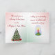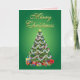 Una Feliz Navidad Dorada encima de un bello árbol de Navidad decorado con regalos en un oscuro fondo verde. Dentro del árbol de Navidad se repite en el lado izquierdo y un gráfico de Velas de Navidad está en el lado derecho. Puede cambiar o agregar texto como desee en el interior de la tarjeta.