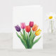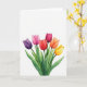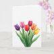 Diseñado con un ramo de estilo acuarela de seis capullos de flores cerradas que se elevan desde el borde inferior sobre un fondo blanco brillante, esta tarjeta mantiene el enfoque en la simple belleza natural 🌷. Los capullos se abren hacia afuera en un suave arco, como si se inclinaran uno hacia el otro como amigos cercanos que comparten un momento tranquilo. Los colores se desplazan a través de las flores desde el púrpura intenso y el fucsia suave hasta el escarlata, el carmesí, la mandarina y el amarillo dorado, con lavados translúcidos que hacen que cada pétalo parezca suavemente estratificado. Los tallos verdes delgados y los racimos de hojas en diferentes tonos de verde añaden profundidad y un sentimiento fresco y de jardín. El generoso espacio abierto alrededor del ramo le da a la escena espacio para respirar, como una pausa no dicha entre dos personas que se entienden. Un breve saludo se sienta cerca de la parte superior en un tono gris claro, dejando que