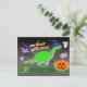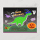 Dinosaurios espeluznantes Happy Halloween Cut & Glue PaperCraft Postcard. ¡Haz tu propio dinosaurio personalizado de Halloween con un estatus de calabaza naranja con esta gran tarjeta de pegamento y corte en 3d! Un adorable dino verde de Diplodocus con un gorra mago azul con estrellas amarillas y una gran calabaza naranja y un cielo oscuro nublado con luna llena y murciélagos voladores, dino y cucharas púrpura volando de Pteradonon y un acosado texto en la parte delantera de la casa "Feliz Halloween". Fácil de hacer, sólo cortar y pegar y su soporte de dino verde está listo para poner en su ventana, escritorio o en su vestidor de habitación! Esta espeluznante tarjeta de papel de Halloween es totalmente personalizable, ¡agrega tus textos e imágenes! ¡Una tarjeta de regalo de Halloween muy especial y única!