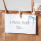 Tarjetas de lugar dobladas con un lazo pintado a mano en acuarela azul polvoriento. Perfecto para una ducha de novia con el tema "Ella está atando el nudo".