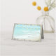 Estas tarjetas de mesa complementan la decoración rústica de los bodas costeros de la playa. Hermosas olas del océano azul acuático chocan contra la playa, enmarcadas con madera rústica templada y luces de cuerda encima.