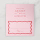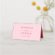 Añada un toque elegante a su recepción de bodas o evento especial con estas modernas tarjetas de boda Wavy Frame. El diseño retro muestra "Table" en un guión rojo manuscrito con espacio para que escriba el nombre y el número de tabla de su invitado. Un borde rojo ondulado rodea el diseño contrastando con un fondo rosa claro. La parte posterior de la tarjeta de lugar doblada muestra sus nombres y la fecha del boda con letras rojas en negrita.