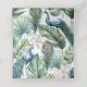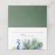 Las cartas de boda de temática pavo real con un hermoso pavo real, plumas y hojas tropicales.