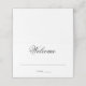 Elegante y clásica tarjeta boda plegada con un diseño sencillo y "bienvenido" en una caligrafía negra formal sobre un fondo blanco. Debajo hay líneas para escribir los nombres de los invitados y el número de la tabla. Un diseño tradicional y elegante, perfecto para un boda de corbata negra.