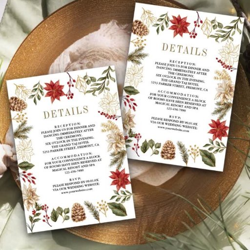 Los huéspedes podrán admirar esta elegante tarjeta con hermosas flores rojas de poinsettia y hojas rústicas de pino.