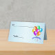 Esta tarjeta plegada de pie para tus fiestas, eventos y bodas es azul claro con un montón de globos festivos brillantes de varios colores con cortinajes colgantes y una pancarta azul que dice Feliz Cumpleaños. Personalizar el nombre, el área de número de tabla y el texto de la parte posterior con las plantillas.