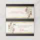 Estas tarjetas de lugar o tarjetas de acompañamiento para el shower de la novia, plegadas, chic y atrevidas, coinciden con la colección de invitaciones para el shower de la novia que se muestra a continuación y presentan una paleta de colores negro y marfil con acentos de franjas finas de oro simulado en la parte superior e inferior en los lados frontal y posterior con hermosos ramos de rosas rosadas, marfil y amarillas pálidas con dos Lirios Peruanos naranjas y follaje verde en el lado izquierdo. Las líneas para el nombre del invitado y el número de mesa están impresas en negro y rosa coral, con las palabras "POR FAVOR, SIENTESE EN" en verde salvia en el frente y la parte posterior tiene un mensaje personalizable en rosa coral para agradecer a sus invitados por asistir a su evento.