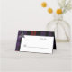 Elegante tarjeta de plaza plegada de enlucido plateado hecha en el clásico patrón de lona tartán marrón. Un nudo triangular celta de tono plateado decora el borde del área de texto blanco. Personalizado a mano para cada huésped en la recepción.