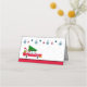Tarjeta de lugar doblada con un auto rojo fresco que lleva un pino de navidades verdes sobre su techo y un regalo escondido en el baúl abierto. Tiene un bonito estilo retro de los años cincuenta. Bolas de navidad, copos de nieve y estrellas colgadas en la parte superior.
