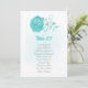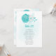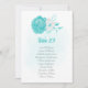 flores románticas turquesas y blancas sobre una bonita carta de cartas con números de asientos en la mesa de corona. Los detalles del purpurina se simulan.