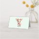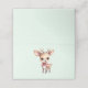 A place card with an illustration of an adorable baby deer. Big eyes big ears with a large head and little brown antlers. Wearing a big red bow.