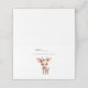 A table place card with an illustration of an adorable baby deer. Big eyes big ears with a large head and little brown antlers. Wearing a big red bow.