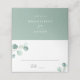 Elegante carta de matrimonio con un diseño sencillo, con una vegetación de eucaliptos pintada en la esquina superior izquierda y en la esquina inferior derecha. Debajo hay líneas para escribir los nombres de los invitados y el número de la tabla. El reverso tiene sus nombres y la fecha de boda sobre una sombra de color verde medio a juego. Estas rústicas tarjetas botánicas de boda con un toque moderno son perfectas para un boda de primavera o verano.