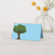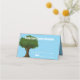 Puedes personalizar tus tarjetas de lugar de reunión familiar azul cielo con texto blanco personalizado. Un árbol está en la parte trasera y delantera de las cartas. La palabra 'tabla' aparece junto a una línea para el número de tabla.