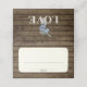 Frasco rústico con flores azules sobre fondo de madera de granero, tarjeta de asiento plegada con área blanca para escribir a mano nombres y número de mesa y nombres personalizados y mensaje en el reverso.