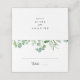 Esta tarjeta de boda de caligrafía de eucalipto verde es perfecta para un boda moderno. El diseño presenta hermosas hojas verdes de eucalipto pintadas a mano, ensambladas en bonitos ramos para embellecer tu evento. Personaliza la tarjeta de la parte trasera del lugar con los nombres de la novia y del novio y la fecha.