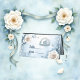 Marco floral con Rosas y diseño celta. La imagen presenta un delicado marco floral con una estética suave y onírica. Las rosas blancas con centros beige sutiles y las hojas verde-azul mudas adornan las esquinas superior izquierda y inferior derecha. El marco en sí está construido con un diseño de inspiración celta y azul glacial. Un patrón de nudo celta circular débil es visible en el fondo.