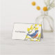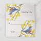 Esta tarjeta plegada de pie para tus fiestas, eventos y bodas es blanca con un lindo pájaro rojo y azul que está cantando en una rama con flores amarillas bonitos. Personalizar el nombre, el área de número de tabla y el texto de la parte posterior con las plantillas.