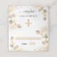 Personalice y agregue un nombre. Un fondo blanco, decorado con brotes de eucaliptos dorados, chispas de purpurina de imitación dorada y una cruz dorada. Con la palabra bautismo escrito con una escritura de estilo con letras a mano moderna.