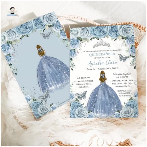 Soft Baby Blue Floral Silver Quinceanera Birthday Diseñado por The Happy Cat Studio