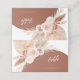 Una elegante carta de boda con temática de terracota bohemia de otoño para el número de la mesa con letras caligráficas acentuadas con acuarela de color rosa mudo, rosas secos morado y blanco, pampas y hojas de palma con un fondo de arco lateral.