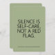 Habla mucho sin decir una palabra. Esta carta audaz muestra el mensaje fortalecedor: "EL SILENCIO ES AUTOCUIDADO, NO UNA BANDERA ROJA." - un regalo reflexivo para los introvertidos, los defensores de la salud mental o cualquiera que honre la fuerza silenciosa. Tarjeta de salud mental, tarjeta de autocuidado, tarjeta de introvertido, tarjeta de empoderamiento, cita de silencio, fuerza tranquila, tarjeta de presupuesto inspirador, tarjeta de afirmación de personalizado, wellness mental, bienestar emocional, papel feminista, tarjeta de mensaje en negrita, regalo de terapia, tarjetas de zazzle, tarjeta de apoyo, regalo de autoamor, tarjeta mental, regalo de empoderamiento, tarjeta única tarjeta de aliento