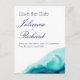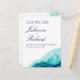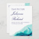 Una tarjeta postal de "aviso de boda" moderna y elegante con acuarela, presenta un mar turquesa abstracto, todos tus detalles están escritos en una mezcla de tipografía moderna y de escritura.