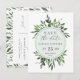 tarjeta de aviso de boda con flores acuarelas frondosas. Con hermosas hojas de acuarela y tipografía moderna y audaz, esta invitación de aviso de boda está en la tendencia actual y es perfecta para cualquier temporada. Parte de un conjunto de boda