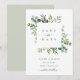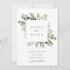 Esta invitación de boda con aviso de fecha de salvación presenta eucalipto pintado con acuarela, follaje verde, hojas verdes y marco cuadrado. Para una personalización más avanzada de este diseño, haga clic en el enlace "Personalizar más". También están disponibles artículos coincidentes.