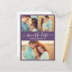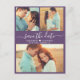 Anuncio de tarjeta postal de aviso de boda de colaje de 3 fotos con caligrafía moderna elegante en color púrpura malva. Plantilla de diseño minimalista chic con tres (3) fotos de pareja y tipografía de letra cursiva elegante „Save the Date” y entre el nombre de la pareja un pequeño motivo de corazón de amor en blanco sobre fondo de color malva, púrpura polvoriento o lavanda. Si necesita ayuda o artículos coincidentes, por favor contácteme.