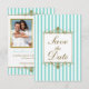 Esta elegante y sofisticada tarjeta de aviso de fecha con foto en azul aqua y rayas blancas con acentos dorados está impresa en papel blanco básico y tiene un espacio para que agregues tu propia foto digital. El texto y la elección del papel son personalizables. Si necesitas artículos adicionales que coincidan, por favor envía un correo electrónico a niteowlstudio@gmail.com con tu solicitud.