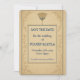 Celebre su próximo matrimonio con esta elegante tarjeta de aviso de fecha con tema egipcio, que presenta un motivo de loto sagrado y un fondo de papiro ornamentado acentuado en rico dorado. El refinado diseño vintage evoca una herencia cultural atemporal, lo que supone un sofisticado adelanto de su día especial.