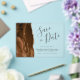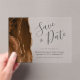 Esta elegante tarjeta moderna de aviso de fecha presenta un borde de ágata de acuarela marrón mocha recortado con brillo de oro falso. El texto personalizable combina la escritura a mano en gris carbón, fuentes copperplate e itálicas en un fondo transparente claro.