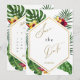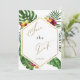 Tarjeta de "Save the Date" con diseño tropical, hojas tropicales, flores amarillas y rojas, geométricos dorados y caligrafía. Fácil de personalizar calendario en la parte trasera donde