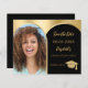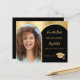 En la parte delantera: Agregue su propia foto vertical del graduado. Un marco de arco de foto dorado falso. Un fondo clásico dorado falso y negro, texto dorado. Plantillas para un nombre y fecha. El nombre y el texto: Save the Date están escritos con un estilo de letra manuscrita moderna. Con una gorra, borla.