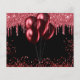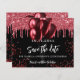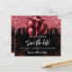 Una invitación femenina y moderna para una Quinceñera, fiesta de cumpleaños número 15. Un fondo negro decorado con brillo falso rojo y globos. Personalice y agregue una fecha y nombre/edad. El texto: Save the Date está escrito con un estilo de letra manuscrita grande y moderno.