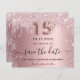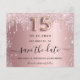 Una tarjeta de aviso para una quinceañera, fiesta de cumpleaños número 15. Fondo rosa con confeti rosa y plateado falso. Personalice y agregue una fecha y nombre/texto. El texto: Save the Date está escrito con un estilo de letra manuscrita de moda con florituras. Número 15 con una fuente de estilo globo.