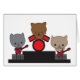 Gatos al estilo kawaii en gris, marrón y tan tocan guitarra, bajo y tambores en una banda con una tarjeta
