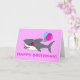 Tarjeta de saludo con tiburón lindo con flores rosadas que sostiene globos fiestas en colores rosa, violeta y turquesa. El texto dice "¡Feliz cumpleaños!" El diseño es personalizable y se puede personalizar el texto.