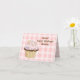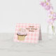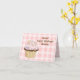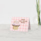 Una fantástica tarjeta de felicitación de cumpleaños, decorada con un quequito de chocolate con helado rosa y corazones coloridos, colocada sobre un fondo de gingham rosa y blanco. El texto marrón divertido, en la parte superior, dice: Deseos dulces de cumpleaños. Personaliza el texto dentro y fuera con tu propio saludo y nombre.
