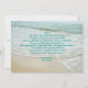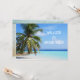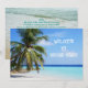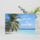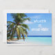 Tarjetas de bienvenida a clase con mensaje del profesor. Personalice con texto en la parte frontal y trasera. La imagen es agua del océano azul tropical y una palmera. El texto de ejemplo es, “Bienvenido a cualquier grado”. En la parte trasera, cree un mensaje para el estudiante sobre una imagen de arena de playa.