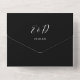 Invitación de boda completa con tipografía elegante sobre fondo negro. La tarjeta incluye una parte de RSVP perforada con código QR. Diseñada por Thisisnotme©