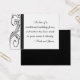 Practica algo de amabilidad boda al concertar una tarjeta de donación en la recepción matrimonial de tus invitados. La elegante Tarjeta de Favor de la Caridad de los Bodas de Swirls Negros y Blancos afirma que en lugar de un favor tradicional del partido, se ha hecho una donación en su nombre a la caridad. Personalizar esto agregando el nombre de la organización benéfica favorita y los nombres personales de la novia y el novio. Esta elegante tarjeta de caridad de boda personalizada presenta un diseño giratorio en blanco y negro.