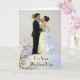 Elegante tarjeta de boda, con una romántica figura de novios en la parte superior del pastel de boda, y el texto "En tu día de boda". Personaliza el texto según tus necesidades.