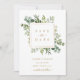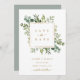 Esta invitación de boda para guardar la fecha presenta eucalipto pintado con acuarela, vegetación, hojas verdes y un marco cuadrado dorado. Para una personalización más avanzada de este diseño, haga clic en el enlace "Personalizar más". También están disponibles artículos coincidentes.