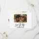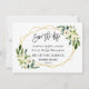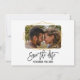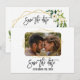Diseño de tarjeta único y elegante que presenta hermosos ramos de rosas y peonías de acuarela blanca, un marco dorado falso, moderna letra a mano "save the date", sobre un fondo blanco. Utilice la herramienta Personalizar para agregar su información, cambiar las fuentes y el color de fondo. Para artículos coincidentes, visite mi colección White Floral Gold Frame.