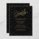Pequeñas estrellas de oro purpurinoso brillan en nubes de confeti alrededor del borde de esta hermosa tarjeta de invitados a la boda de oro y negro, con un guión de efecto purpurina dorado que dice "Detalles". Agradable, moda y encantadora. Perfecto para una aventura fabulosa. Obra original de Colleen Michele. Por favor, tenga en cuenta que no hay un efecto real de purpurina de oro o hoja de oro en las estrellas y el guión; en esta invitación no se utilizará ningún purpurina, hoja de oro o tinta metálica.