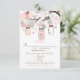 Ilustraciones caprichosas de tarros Mason rosados y cuerdas de corazones colgando de un árbol con dos pájaros de amor marrones rodeados de una variedad de flores rosadas y marrones. Es perfecto para bodas de verano, primavera y al aire libre.