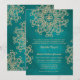 Una hermosa tarjeta de boda en tono azul verde turquesa JEWEL TONED y dorado con un medallón ornamental de sari exótico inspirado en la India con un diseño floral y de lotus radiante. Esta elegante y hermosa invitación de boda de estilo indio moderno de lujo es perfecta para cualquier ocasión formal con un tema de Asia Oriental, Indonesia, Marruecos, Aladín o Las Mil y Una Noches. Diseñado por Chrissy H. Studios, LLC. Todos los derechos reservados.